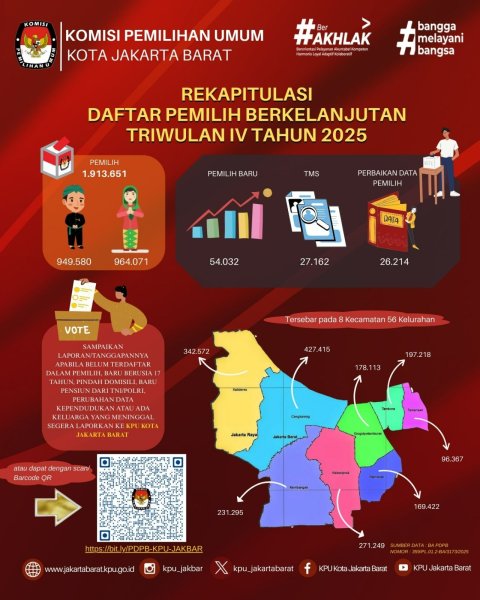 Jakarta, 8 Desember 2025 - KPU Kota Jakarta Barat melaksanakan Rapat Pleno Rekapitulasi Pemutakhiran Data Pemilih Berkelanjutan (PDPB) Bersama Stakeholder Tingkat Kota Jakarta Barat Triwulan IV Tahun 2025. Rapat pleno dipimpin oleh Ketua KPU Kota Jakarta Barat, Endang Instianti, dan pemaparan data dilakukan oleh Ketua Divisi Perencanaan, Data, dan Informasi, Subro Malisi. Rapat ini memaparkan hasil kegiatan Pencocokan dan Penelitian Terbatas (Coktas) yang dilaksanakan oleh KPU Kota Jakarta Barat pada Triwulan IV Tahun 2025. Dari pemaparan data pada kegiatan tersebut, diketahui bahwa jumlah Daftar Pemilih Berkelanjutan Kota Jakarta Barat sebanyak 1.913.651 jiwa, dengan rincian sebagai berikut: Cengkareng: 427.415 jiwa Grogol Petamburan: 178.113 jiwa Kalideres: 342.572 jiwa Kebon Jeruk: 271.249 jiwa Kembangan: 231.295 jiwa Palmerah: 169.422 jiwa Tamansari: 96.367 jiwa Tambora: 197.218 jiwa ....