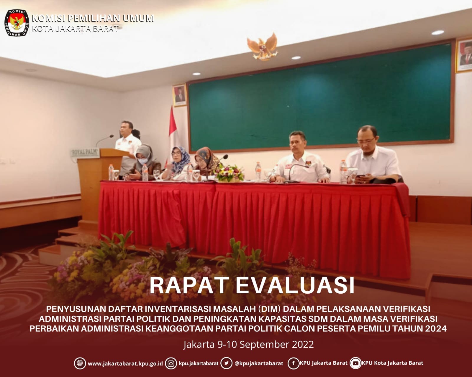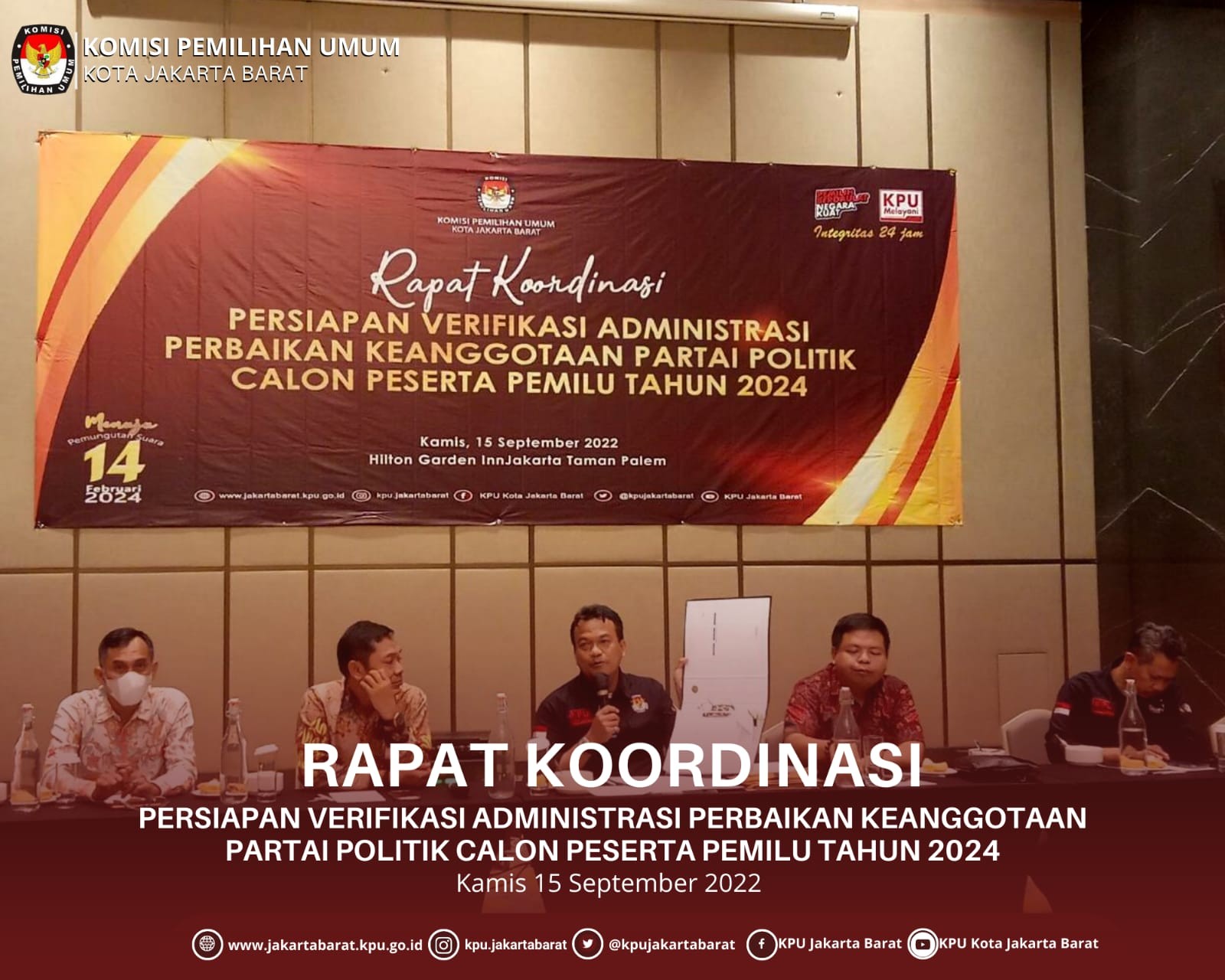 Bertempat di Hotel Hilton Inn Cengkareng KPU Jakarta Barat melaksanakan Rapat Koordinasi Persiapan Verifikasi Administrasi Perbaikan Keanggtotaan Parpol pada tanggal 15 September 2022. Kegiatan tersebut dihadiri oleh Ketua KPU DKI Jakarta yaitu Sunardi, Ketua Bawaslu Kota Jakarta Barat yaitu oding Junaidi, Perwakilan Polres Jakarta Barat dan Partai Politik tingkat KPU Jakarta Barat Maksud dan tujuan dalam kegiatan tersebut adalah bahwa seluruh partai politik telah menerima hasil verifikasi administrasi keanggotaan parpol bahwa ada partai politik yang sudah memenuhi syarat ambang batas yaitu 1000 Anggota dan yang belum memenuhi syarat ambang batas dibawah 1000 Anggota yang belum memenuhi syarat untuk dapat memperbaiki data keanggotaanya pada Sipol dalam tahapan Verifikasi Administrasi Perbaikan Keanggotaan Partai Politik Diharapkan kepada seluruh Partai Politik yang data keanggotaanya masih dibawah ambang batas untuk dapat melakukan perbaikan terhadap data yang masih belum memenuhi syarat atau menambah data dan berkoordinasi kepada tingkatan diatasnya untuk diperbaiki yang nantinya data tersebut akan dilakukan verifikasi administrasi perbaikan oleh KPU Kota Jakarta Barat padat jadwal tahapan yang telah ditetapkan