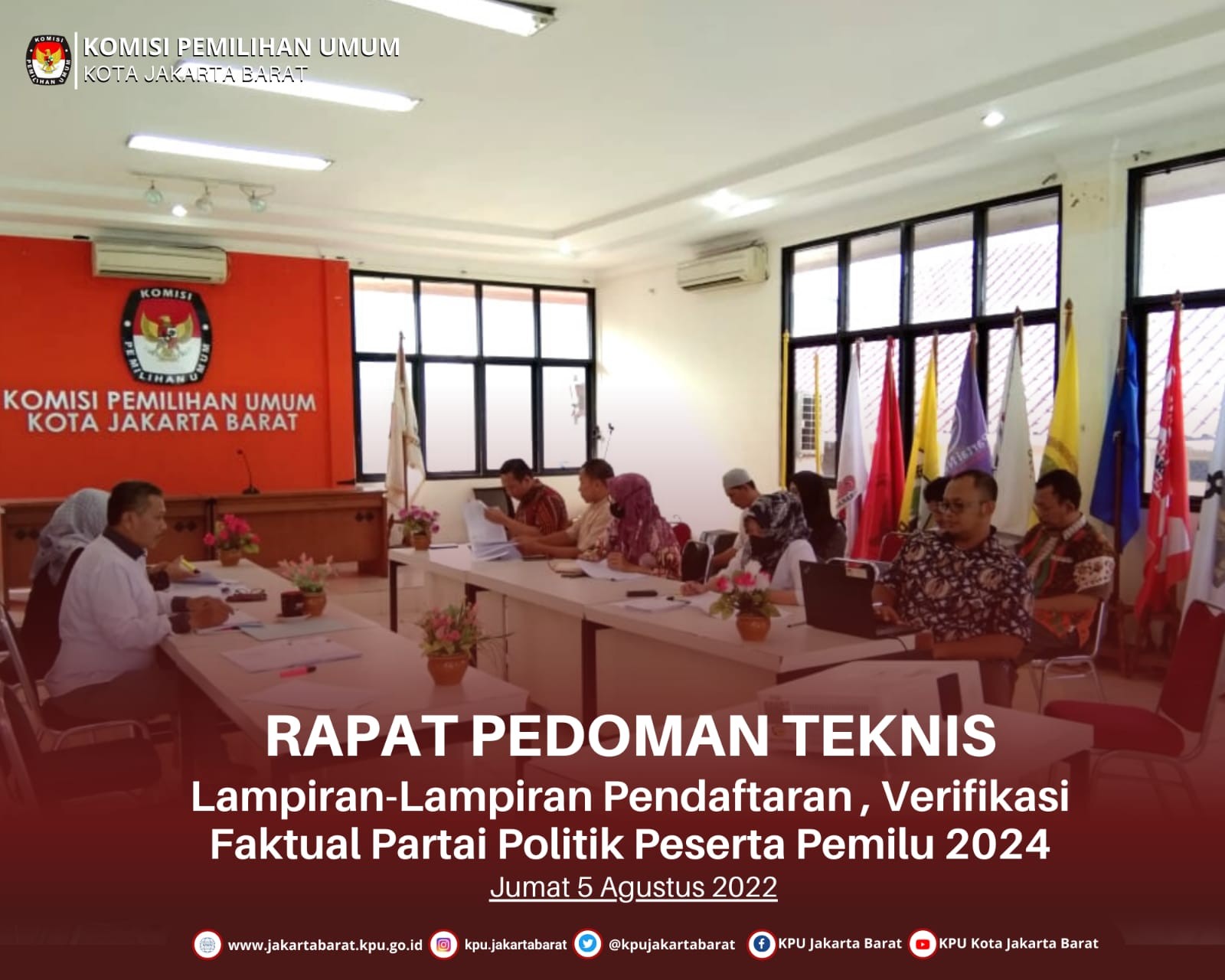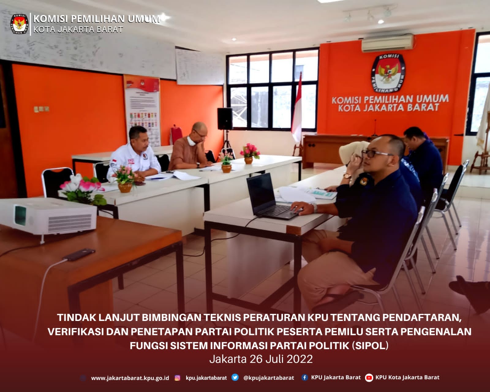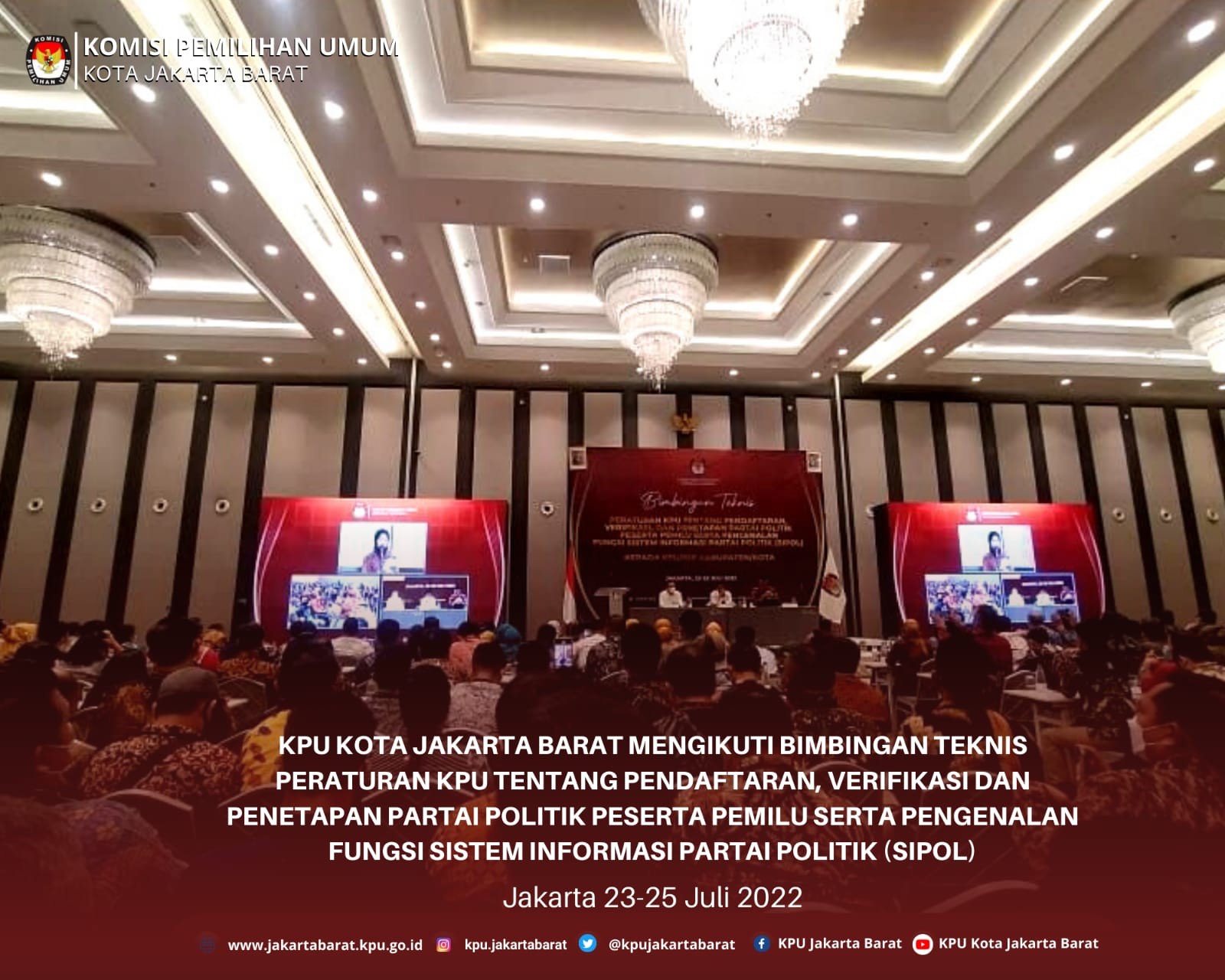 Jakarta 23-25 Juli 2022 KPU Kota Jakarta Barat mengikuti Bimbingan Teknis Peraturan KPU tentang Pendaftaran, Verifikasi dan Penetapan Partai Politik Peserta Pemilu serta Pengenalan Fungsi Sistem Informasi Sistem Politik (SIPOL).