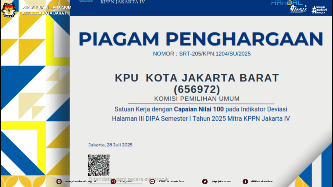 Jakarta, 30 Juli 2025 – KPU Kota Jakarta Barat mendapatkan penghargaan sebagai salah satu Satuan Kerja dengan Capaian Nilai 100 pada Indikator Deviasi Halaman III DIPA Semester I Tahun 2025 Mitra KPPN Jakarta IV. Penghargaan ini diberikan oleh Direktorat Jenderal Perbendaharaan KPPN Tipe A1 Jakarta IV Kementerian Keuangan Republik Indonesia sebagai wujud apresiasi kepada satuan kerja yang telah berupaya menjaga dan mempertahankan nilai indikator Halaman III DIPA. Halaman III DIPA merupakan salah satu indikator yang digunakan dalam Indikator Kinerja Pelaksanaan Anggaran (IKPA). IKPA digunakan untuk mengukur kualitas kinerja belanja dengan tujuan untuk mewujudkan belanja Kementerian Negara / Lembaga yang berkualitas, lebih baik (spending better) dan sesuai dengan tata kelola yang baik (good governance). Sekretaris KPU Kota Jakarta Barat, Adnal Nurba Tjenreng, merespon baik pemberian penghargaan tersebut kepada KPU Kota Jakarta Barat. Ia mengucapkan terima kasih kepada staf KPU Kota Jakarta Barat khususnya Subbagian Perencanaan dan Keuangan, serta berharap agar prestasi ini dapat dipertahankan.