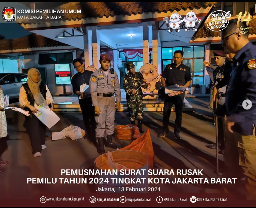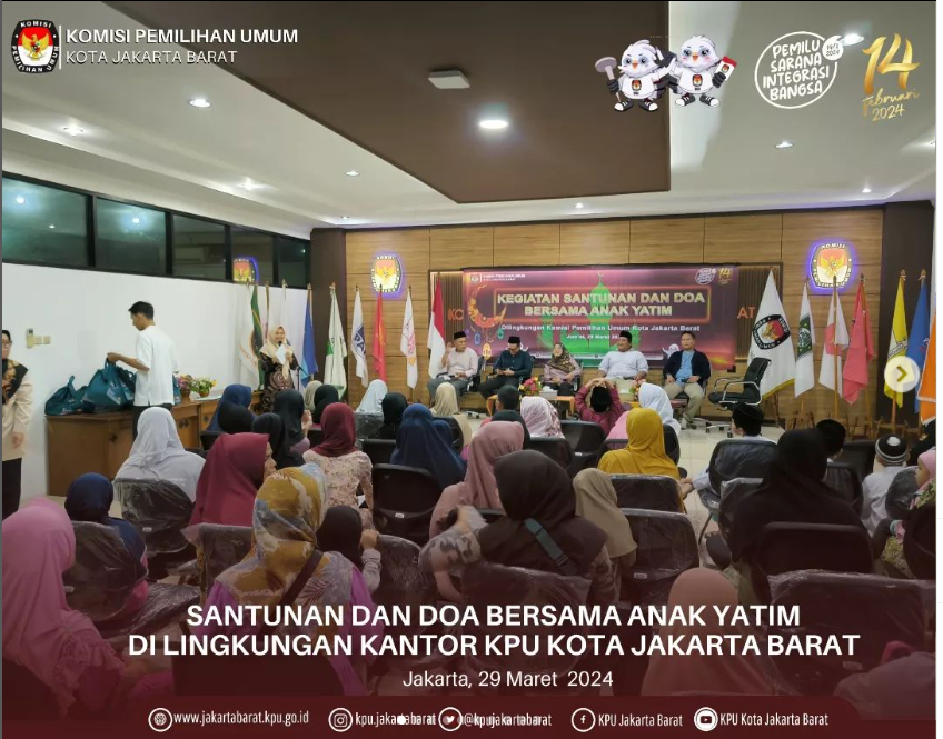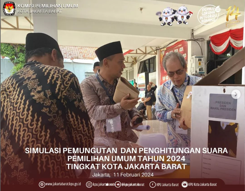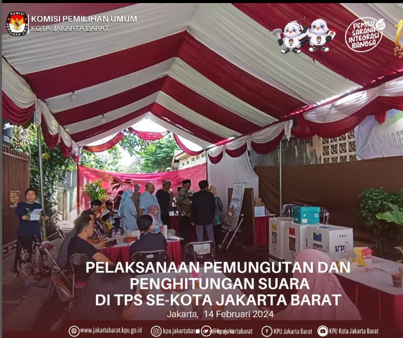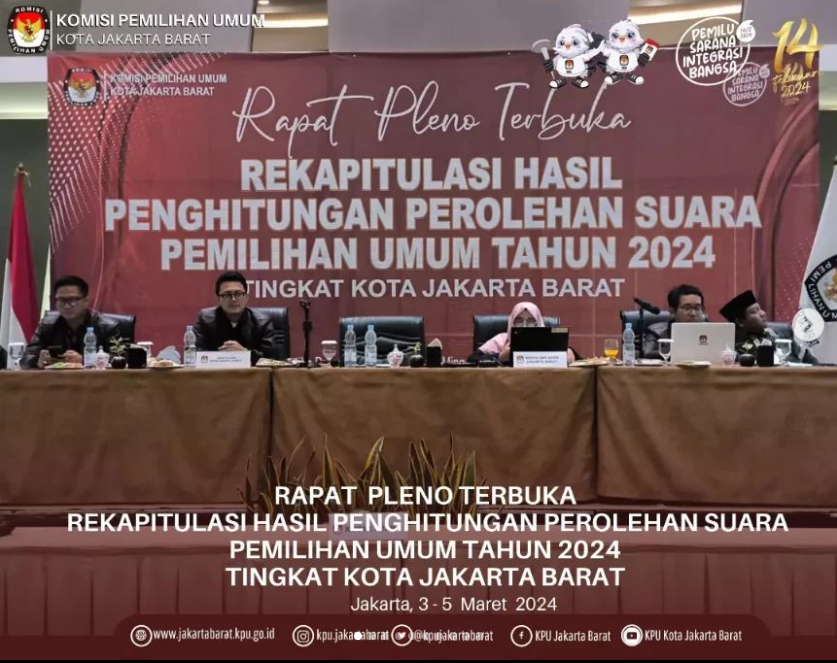 Komisi Pemilihan Umum (KPU) Kota Jakarta Barat menggelar Rapat Pleno Terbuka Rekapitulasi Hasil Penghitungan Perolehan Suara Pemilihan Umum Tahun 2024 Tingkat Kota Jakarta Barat pada Tanggal 3 s/d 5 Maret Tahun 2024 di Hotel Santika Premier Hayam Wuruk Tamansari Kota Jakarta Barat.