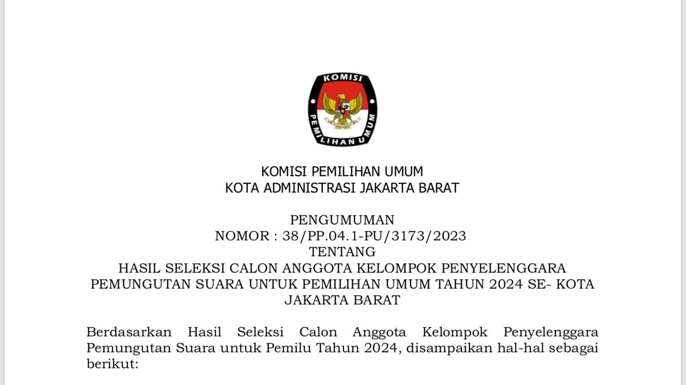 Berdasarkan hasil Rapat Pleno Terbuka Rekapitulasi Hasil Penghitungan Perolehan Suara Pemilu 2024 tingkat Kota Jakarta Barat, berikut disampaikan Berita Acara dan Sertifikat Rekapitulasi Penghitungan Perolehan Suara pada Pemilu 2024: