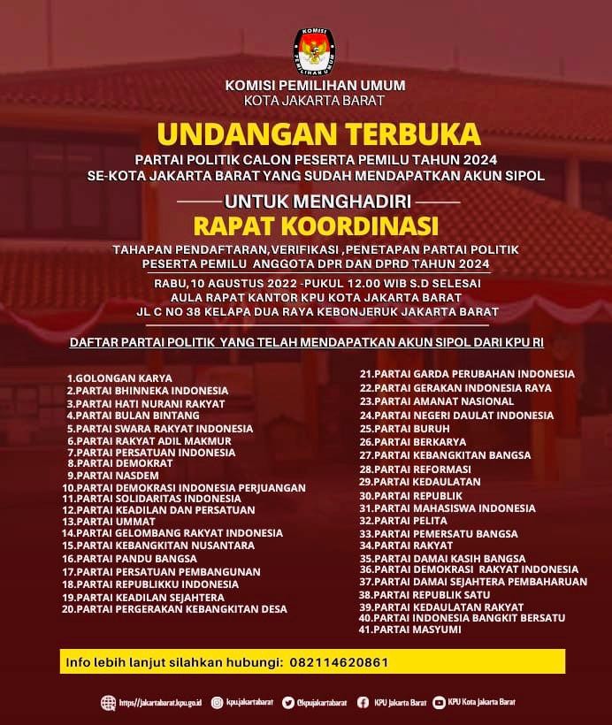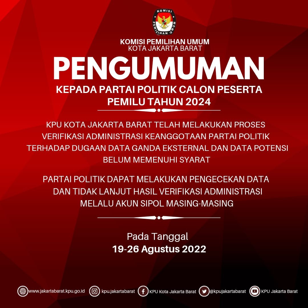 Sehubungan dengan tahapan Verifikasi administrasi Partai Politik calon peserta Pemilu DPR dan DPRD Tahun 2024, KPU Kota Jakarta Barat telah melakukan proses verifikasi administrasi terhadap dugaan data ganda eksternal dan potensi data belum memenuhi syarat. Partai politik dapat melakukan pengecekan data tersebut melalui akun Sipol masing-masing.